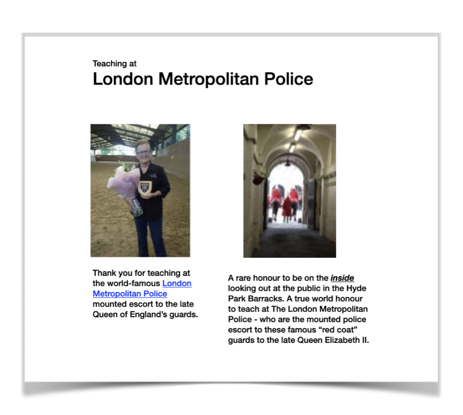 Teaching at the world famous London Metropolitan Police – see them on youtube take off their saddles while jumping the horse!